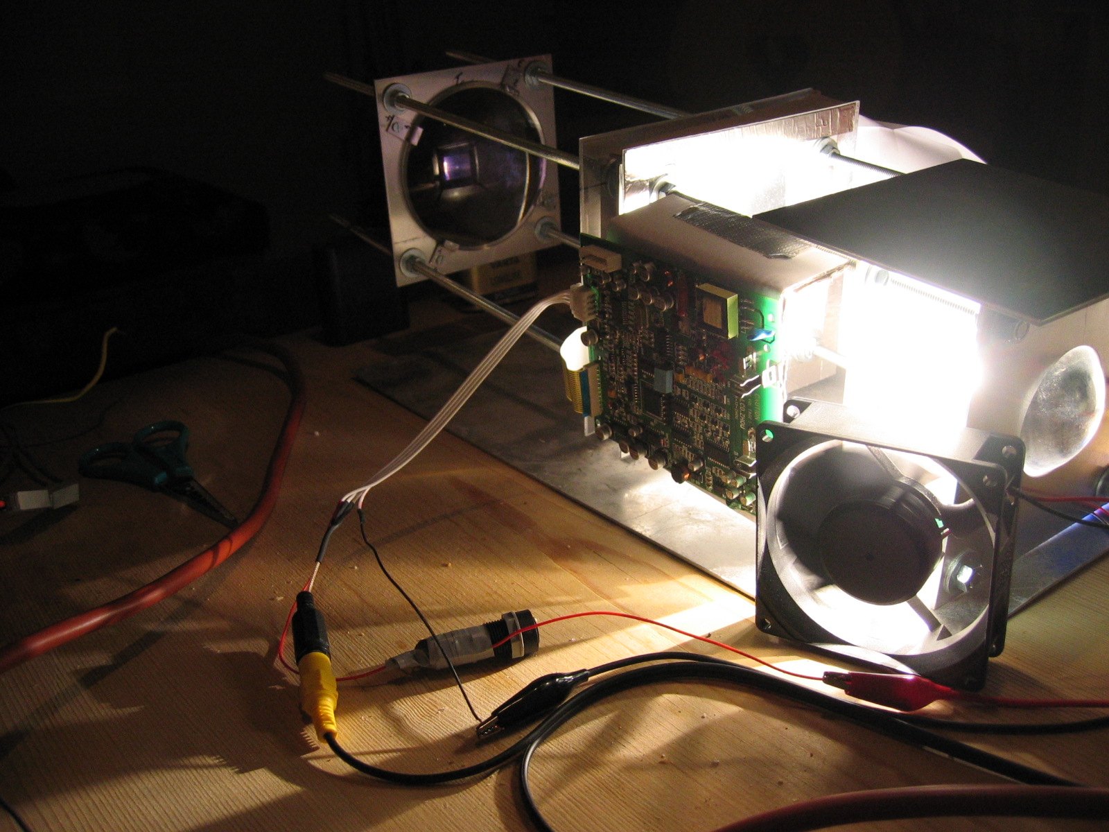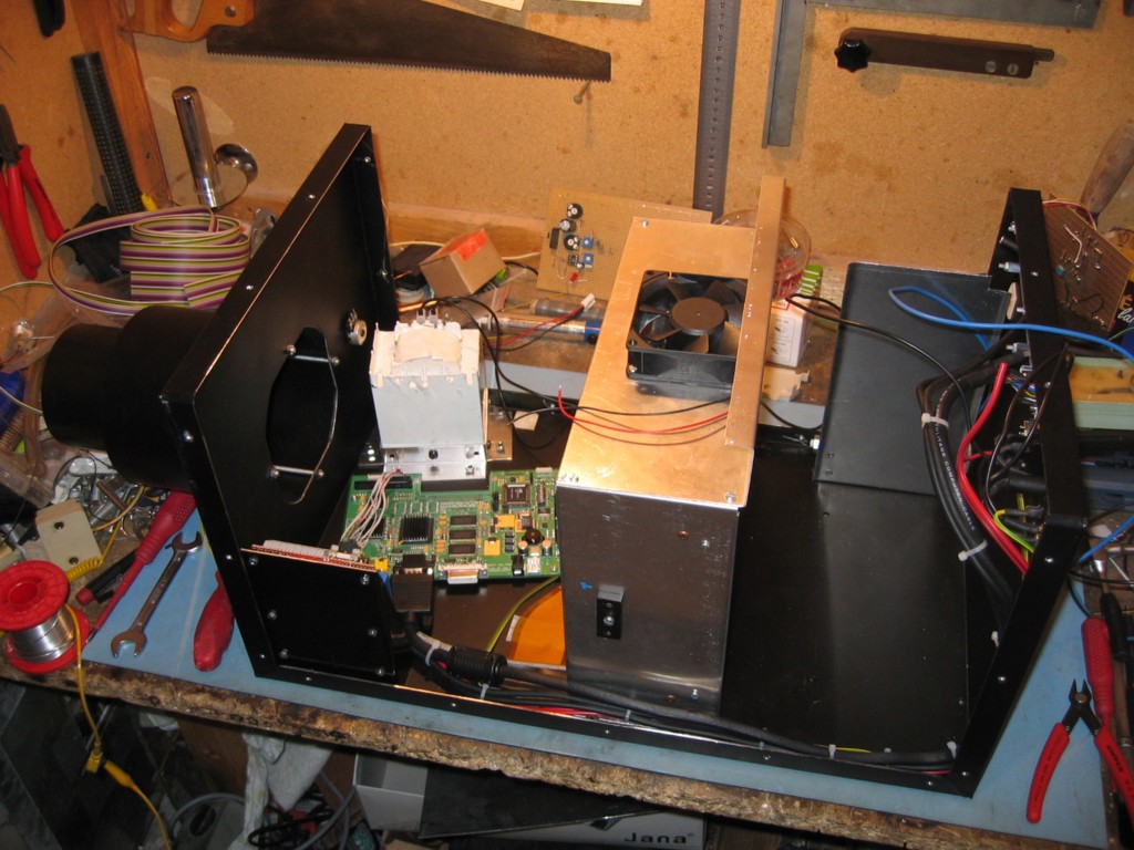 | Zu guter letzt wurden die Gehäuseteile und der TFT-Halter noch mit schwarzer Farbe Lackiert um das auftretende Streulich zu vermindern. Dann musste nur noch alles nach den genau abgemessenen Abständen vom Testaufbau ins Gehäuse eingebaut werden. Puh, jetzt war die Mechanik zum größten Teil fertig verbaut und es konnte mit der Elektronik begonnen werden. Es musste der TFT-Kontroller angeschlossen und sämtliche Leitungen an die Einbaubuchsen des Gehäuses gelötet werden, eine echt Friemelarbeit, die aber doch großen Spaß macht. Zur guten Durchlüfung bekam der Beamer noch eine drehzahlgesteuerte Lüfterregelung, denn so ein Lüfter der immer volle Kanne läuft kann schon mal nervig werden! Die motorische Keystone Korrektur wurde mit Hilfe eines Servos aus dem Modellbaubereich gelöst. Dieser Servo wird von einer Servotestplatiene von Conradelektronik angesteuert. Eine ganz einfache Sache, funktioniert aber super! | ||||||
